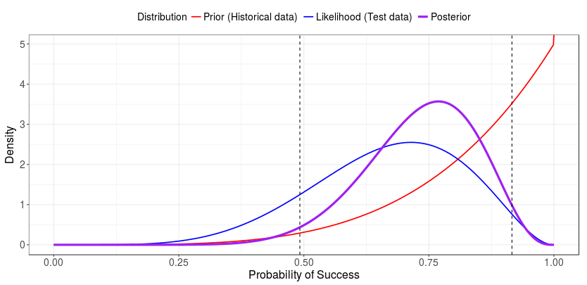 When interpreting this confidence interval, it is important to keep in mind how probability is interpreted in the frequentist framework. This interval can be interpreted as follows: if the test were repeated an infinite number of times and we constructed a confidence interval each time, then 95% of the confidence intervals will contain the true probability of a successful launch. That is, the frequentist approach cannot tell us the probability that this specific interval contains the true probability of a successful launch. However, if we were to proceed in a Bayesian framework, we could obtain exactly this type of interval. That is, we could make a direct probability statement regarding the certainty that our constructed interval contains the true probability of a successful launch, a statement that is likely of strong interest to a decision maker. In doing so, we may also draw on a strength of the Bayesian framework; namely, we may incorporate prior information. We demonstrate this below.How would a Bayesian approach proceed?