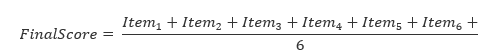 The scores from every item are summed and then the sum is divided by 6 to obtain an overall score between 0 - 100. This process can be expressed formulaically as: