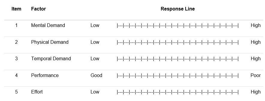 | PHYSICAL DEMAND | Low/High | How much physical activity was required (e.g., pushing, pulling, turning, controlling, activating, etc.)? Was the task easy or demanding, slow or brisk, slack or strenuous, restful or laborious? |