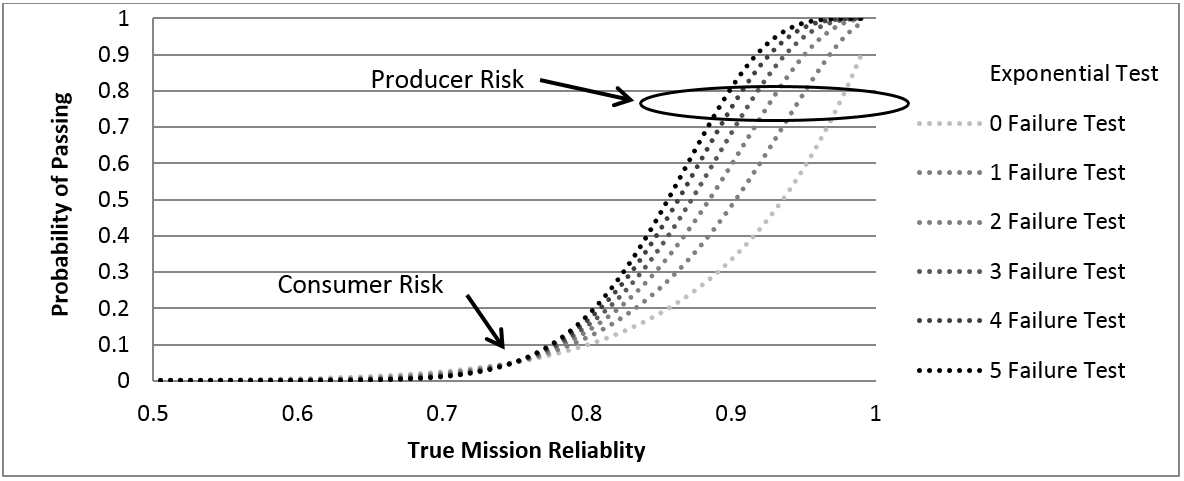 Assessing systems for reliability introduces some unique design aspects. Often, evaluators need to determine the amount of test exposure necessary to confidently demonstrate how a system performs in relation to some standard or requirement. This is a matter of sample or test size, which often involves considerations of the number of systems involved in the test along with the number of shots fired, miles driven, or time in the test (e.g., 1000 operating hours). The more test exposure, the more confident evaluators can be about the system's true reliability. Acceptance Sampling for Probabilistic Reliability: To determine the size of test necessary to demonstrate reliability in terms of the probability of success or failure, evaluators employ acceptance sampling plans. Acceptance sampling plans determine the number of tests that are necessary to guarantee a threshold level of performance. That is, they inform the evaluator how many systems, hours, etc., are needed as well as how many failures are allowed in order to meet the required reliability. When using a sampling framework, the evaluator tests a small number of system units in order to make statements about the performance of all systems of that type. The smaller proportion should be representative of all systems (i.e., randomly selected), as the demonstrated reliability of this sample determines whether the system as a whole (i.e., the program), rather than only the individual sampled units, is accepted or rejected. Larger samples give greater precision in differentiating between good and bad systems, and fewer acceptable failures increase the probability of rejecting a system. Operating Characteristic Curves: The Operating Characteristic (OC) Curve is the primary tool for displaying and investigating the properties of acceptance sampling plans. OC curves plot the the probability of accepting the system against the actual reliability or failure rate of the system at various test sizes and acceptability criteria (i.e., failures allowed). Central to the development of these curves is the balancing of Consumer Risk and Producer Risk. Consumer Risk is defined as the probability that an unreliable system will be accepted, whereas Producer Risk is the probability that a reliable system will be rejected. OC Curves are used primarily to determine the test size necessary to confidently demonstrate reliability.