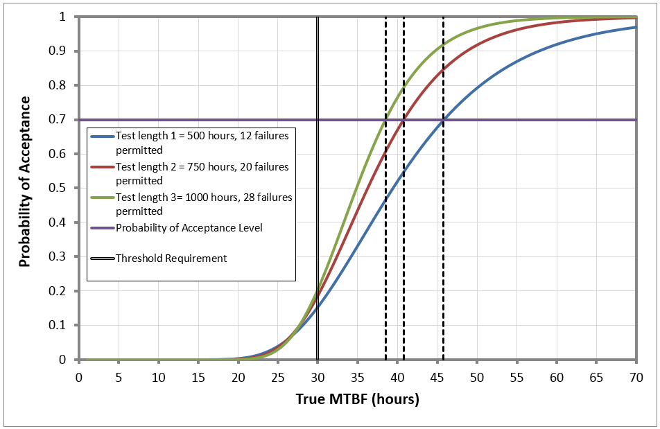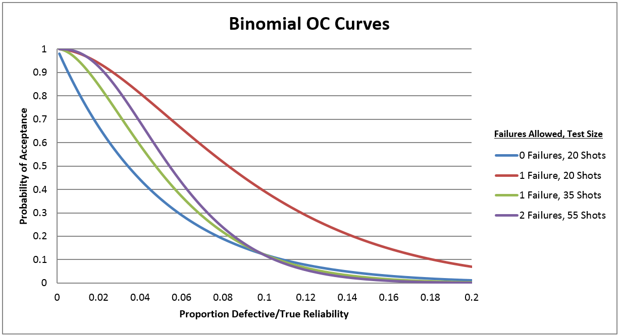 A traditional method for constructing a demonstration test via acceptance sampling would solve the following equations simultaneously for n, the number of samples required, and c, the allowable number of failures to meet the requirement: [latex]1-\alpha = \Sigma^c_{i=0} (^n_i)p^i_{max}(1-p_{max})^{n-i}[/latex] [latex]\beta = \Sigma^c_{i=0}(^n_i)p^i_{min}(1-p_{min})^{n-i}[/latex] where α is the producer’s risk or the probability of failing the test if they deliver a product that has a high reliability [latex](p_{max})[/latex] , and β is the consumer’s risk or the probability of passing a system if the product actually has low reliability [latex](p_{min})[/latex]. In defense applications, evaluators are typically worried most about ensuring that the requirement has been met (minimizing consumer risk) and less about controlling producer risk. Therefore, evaluators construct these curves by first solving the consumer’s risk equation for allowable failures ranging from 0 to some fixed number (often no more than 5 -10 because of limited test resources). In Excel this is easy to do using the Goal Seek Function with the binomial distribution for a fixed number of failures and allowing the total test size to change to match the desired consumer risk. A full curve can then be generated by changing the true probability of failure and calculating the probability of passing the test for a fixed sample size and acceptance criteria (c allowable failures). Several tools are available to help you construct Binomial OC Curves.