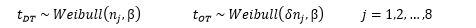 A multiplicative model structure was chosen specifically because it is analogous to the Weibull regression model defined in Equation 1. That is, the shift in the scale parameter from the DT to OT phase is represented by [latex]\delta[/latex].
