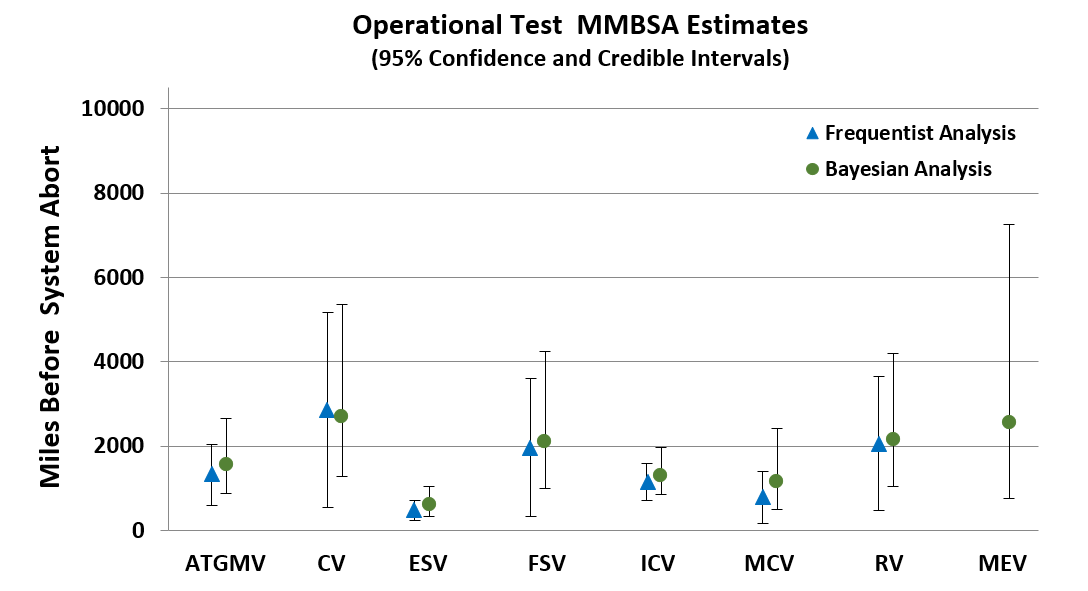 The results of these analyses are presented, compared and contrasted in this section. Table 2 illustrates the results using OT data only (current DoD analysis), the frequentist Weibull regression analysis, and the Bayesian analysis. The first column lists the vehicle variants under consideration, the second column shows the estimate based on the exponential distribution and its exact confidence intervals using the OT data only. The next two columns show the results using the Weibull regression analysis and its Wald confidence intervals for each test phase. Finally, the MMBSA estimate using the Bayesian analysis and the respective credible intervals are shown.