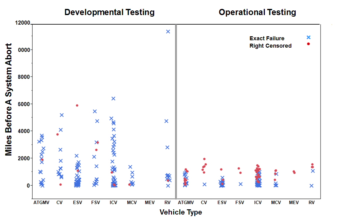 The Army reliability requirement for the Stryker is that the vehicle have a mean of 1,000 miles between System Abort (SA), where an SA is defined by a failure that results in the loss or degradation of an essential function that renders the system unable to enter service or causes immediate removal from service. Table 1 provides a summary of the Stryker FOV reliability data by test phase (DT or OT) and vehicle variant (system configuration). Included in this table are the total number of miles driven, the number of SAs, and the number of right censored observations. Right censoring occurs when the testing of the vehicle was terminated before an SA was observed. Of the 263 observations recorded, 199 of these were SA failures (131 SAs in DT and 68 SAs in OT) and the remaining 64 observations were right censored (12 in DT and 52 in OT).